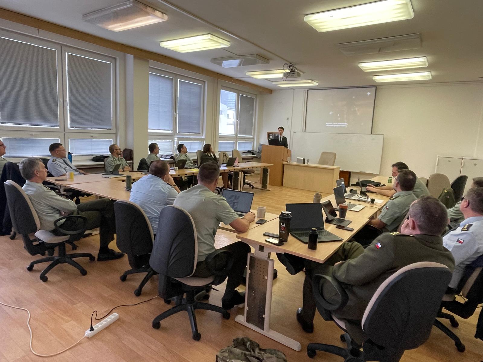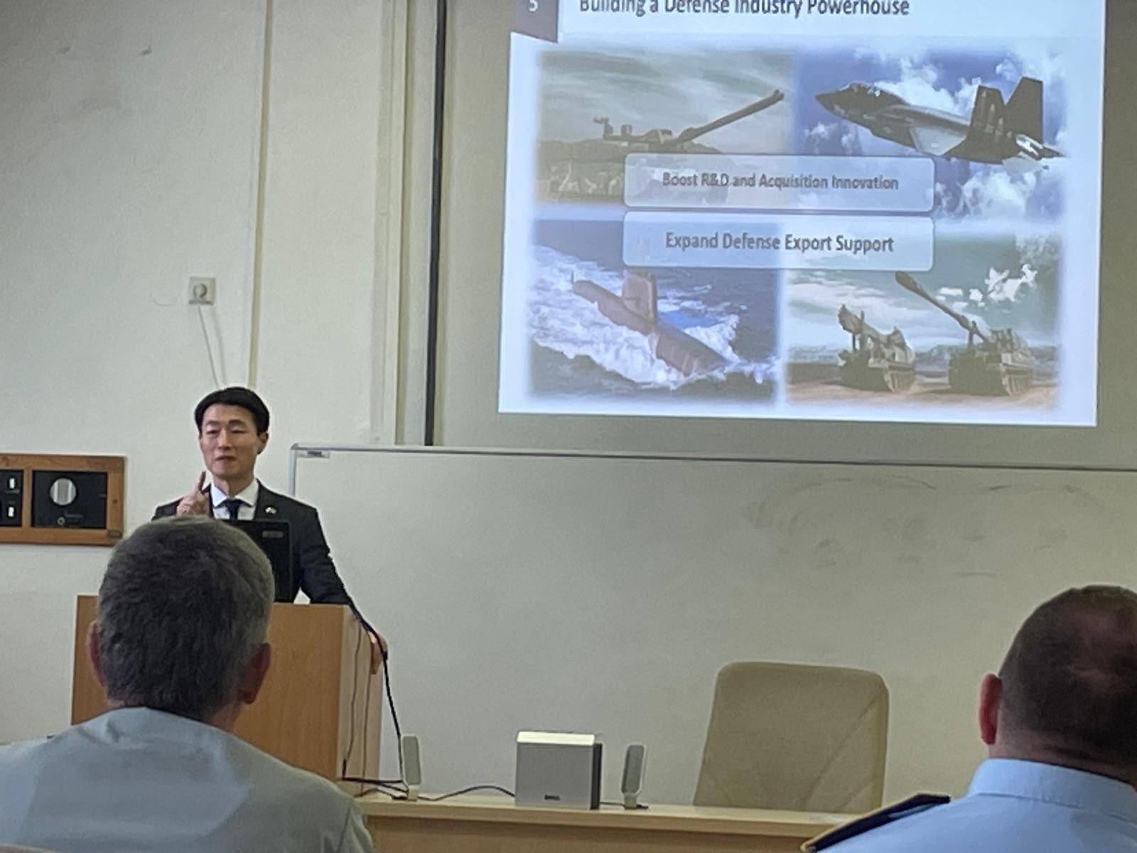Pan konzul si připravil odbornou přednášku pro účastníky 44. kurzu generálního štábu, a to v rámci předmětu Regionální studia. Tento předmět se zaměřuje na strategické a bezpečnostní situace ve vybraných zájmových regionech, politiku a aktivity klíčových státních aktérů ve vazbě na bezpečnostní (národní) zájmy České republiky. Ve své přednášce, která byla velice zajímavá a přínosná, se pan konzul zabýval současnou bezpečnostní politikou své země, jejími cíli a prioritami včetně korejského obranného průmyslu, obranného postavení Koreje ve všech oblastech, a dále seznámil posluchače s aktuální bezpečnostní situací v severoasijském regionu. Neopomenul zmínit důležité milníky korejské novodobé historie, např. korejskou válku v letech 1950-53, jejichž důsledky trvají dodnes. Zajímavá část jeho odborného výkladu byla i pasáž o vztazích se Severní Koreou, o jejím nukleárním programu či demarkační linii.