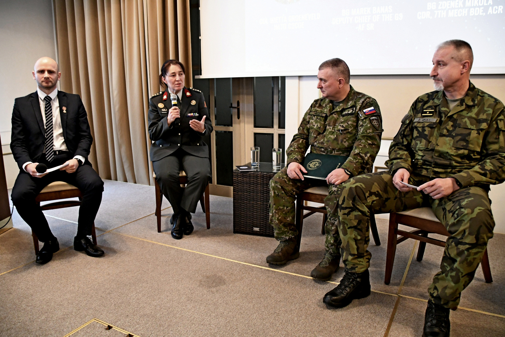 Druhá část workshopu se zaměřila na vývoj systémů velení a řízení (C2C) v průběhu roku 2025. Diskuse se zúčastnili plk. Mietta Groeneveld, ředitelka NATO Command and Control Centre of Excellence, armádní představitelé brig. gen. Marek Banas, zástupce náčelníka generálního štábu – náčelník štábu Ozbrojených sil Slovenské republiky, brig. gen. Zdeněk Mikula, velitel 7. mechanizované brigády, Armáda České republiky, a plk. Martin Hlaváček ze Sekce komunikačních a informačních systémů Ministerstva obrany.